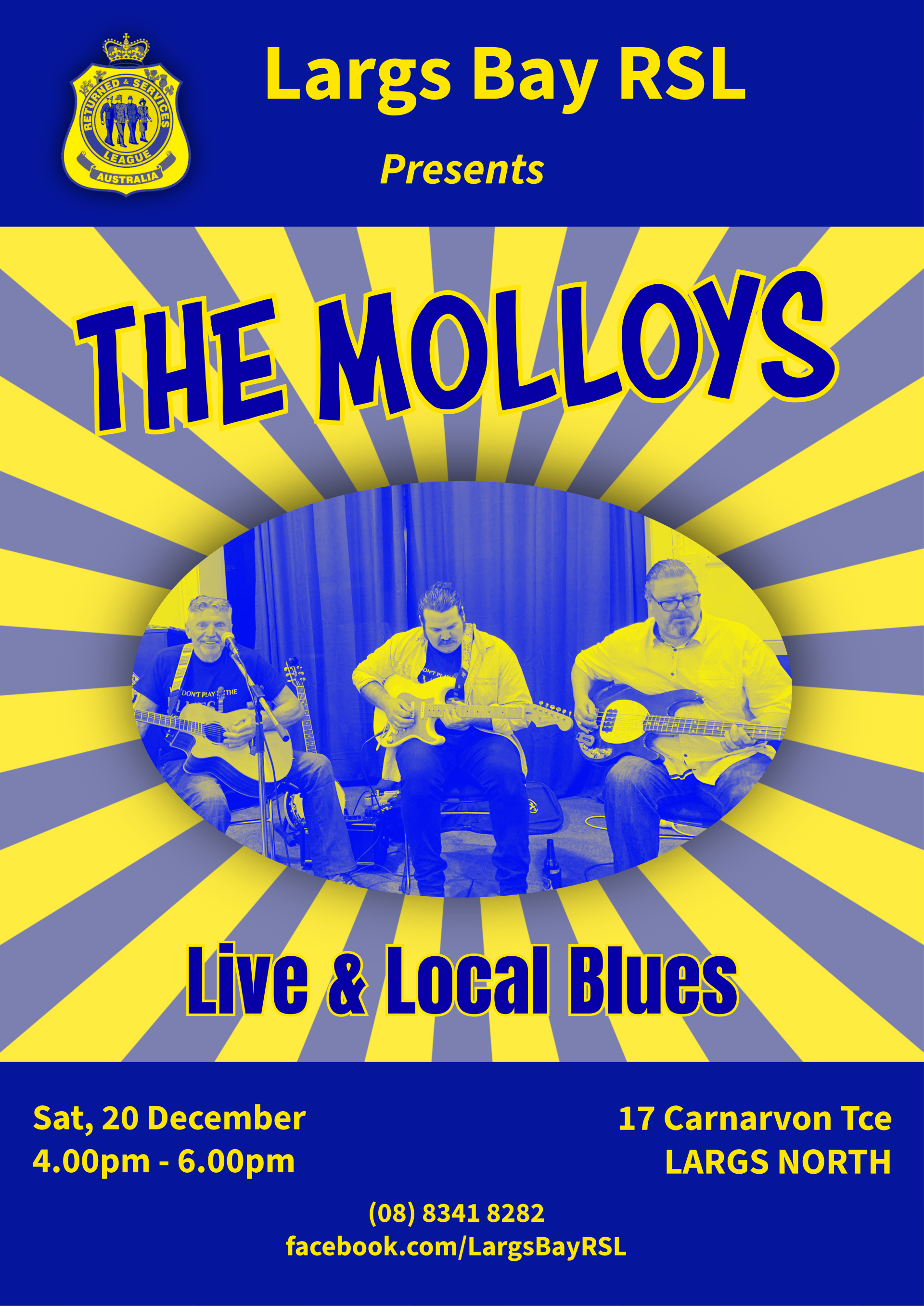 Join me and father-son combination Paul and Luke Molloy at the Largs Bay RSL for a fun session of Blues classics and quirky originals. We are true locals, singing and playing a range of instruments including acoustic and electric guitars, resonators, bass and banjitar. It's all about the groove - from the swamp to the speakeasy and beyond. Pop in for great value drinks and stay for a hearty meal in this terrific local community asset.